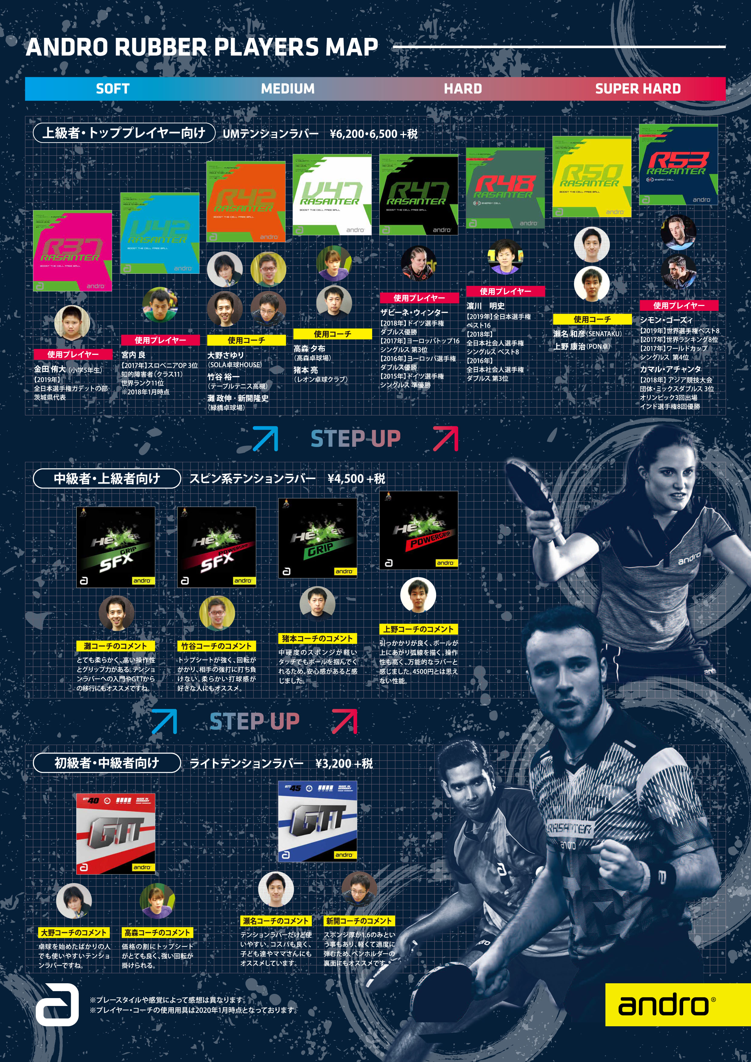 各ラバーのおすすめプレイヤーレベルや硬度、どういうプレイヤーが使用しているか、契約コーチのコメント等を一挙掲載!
