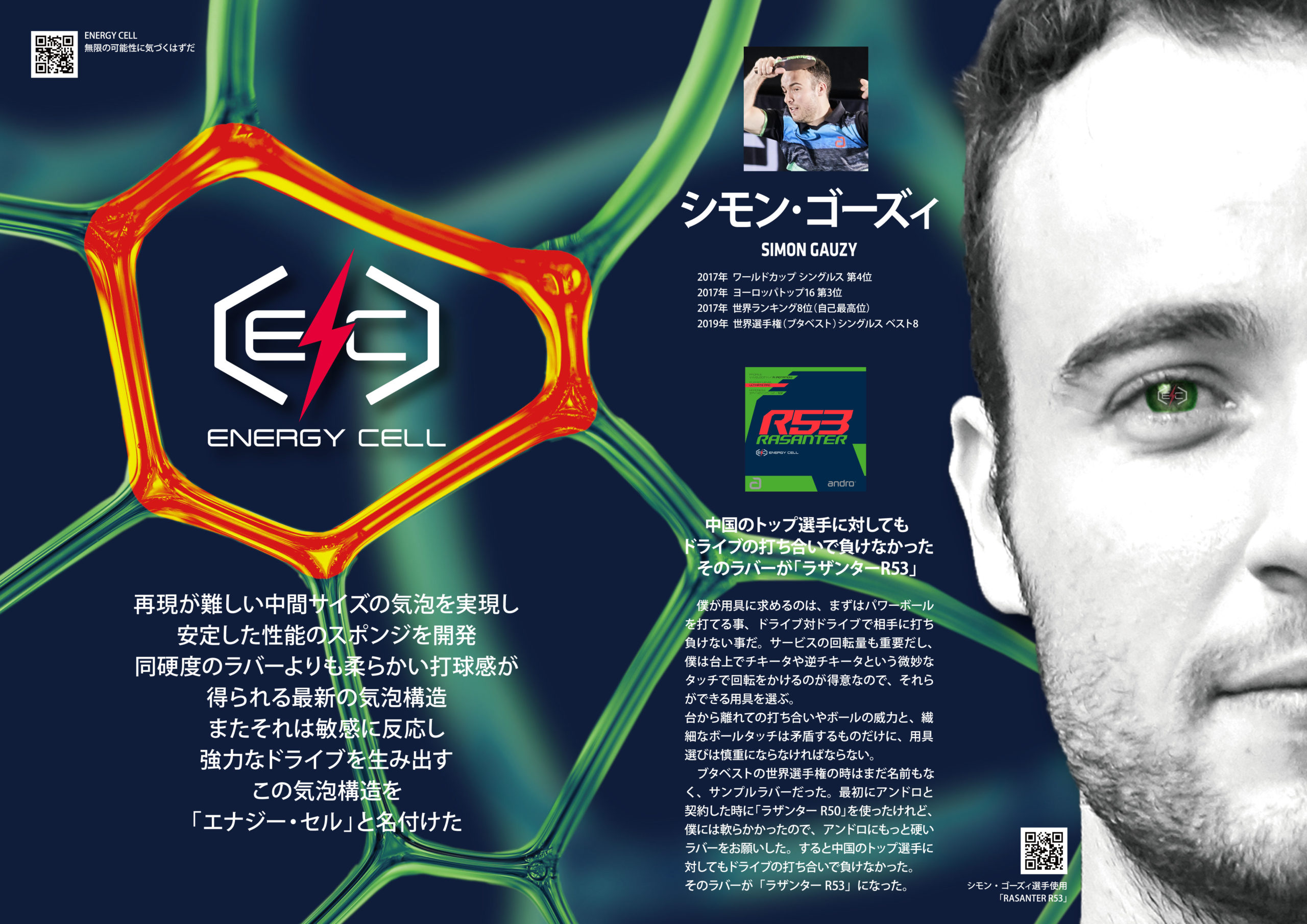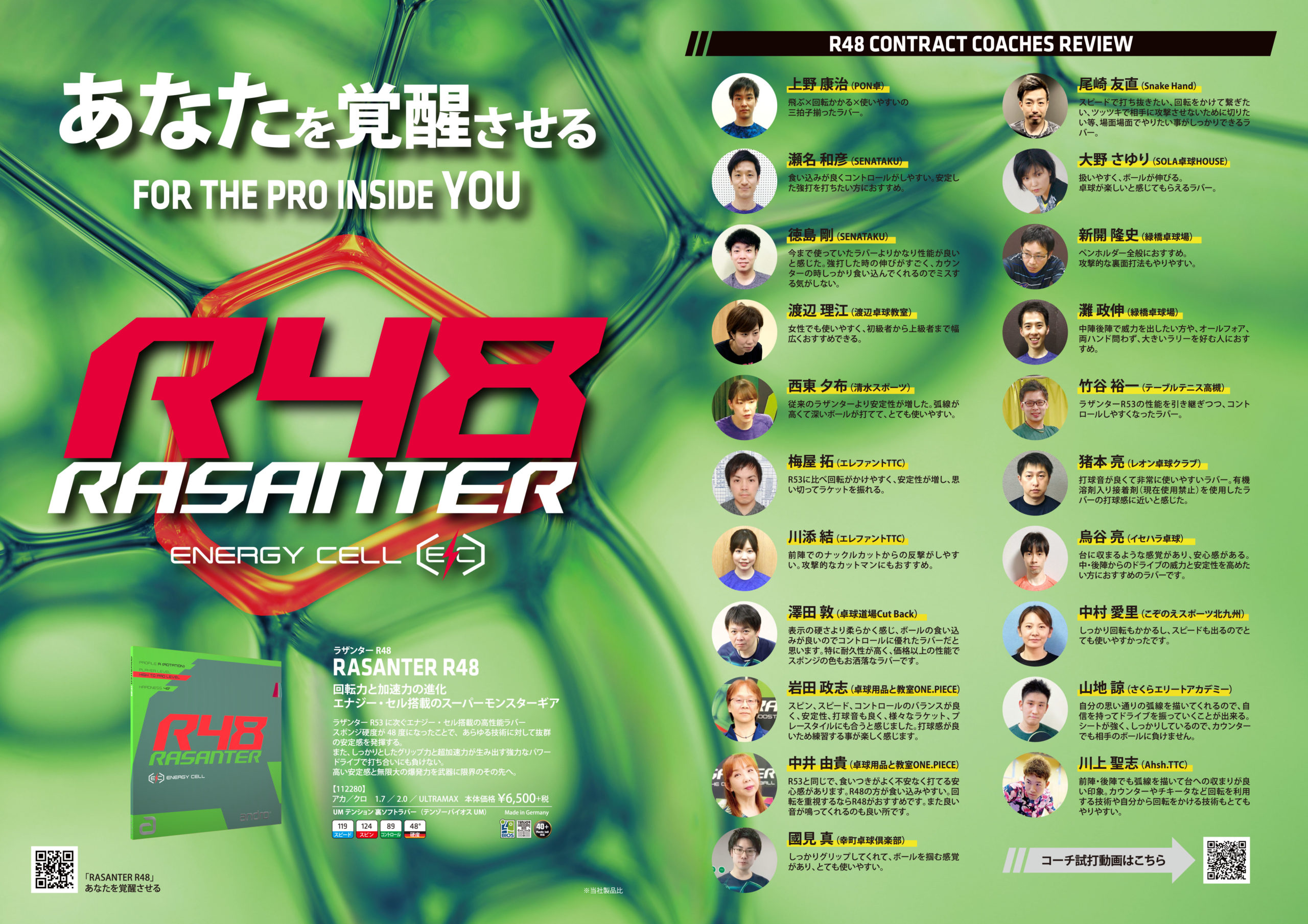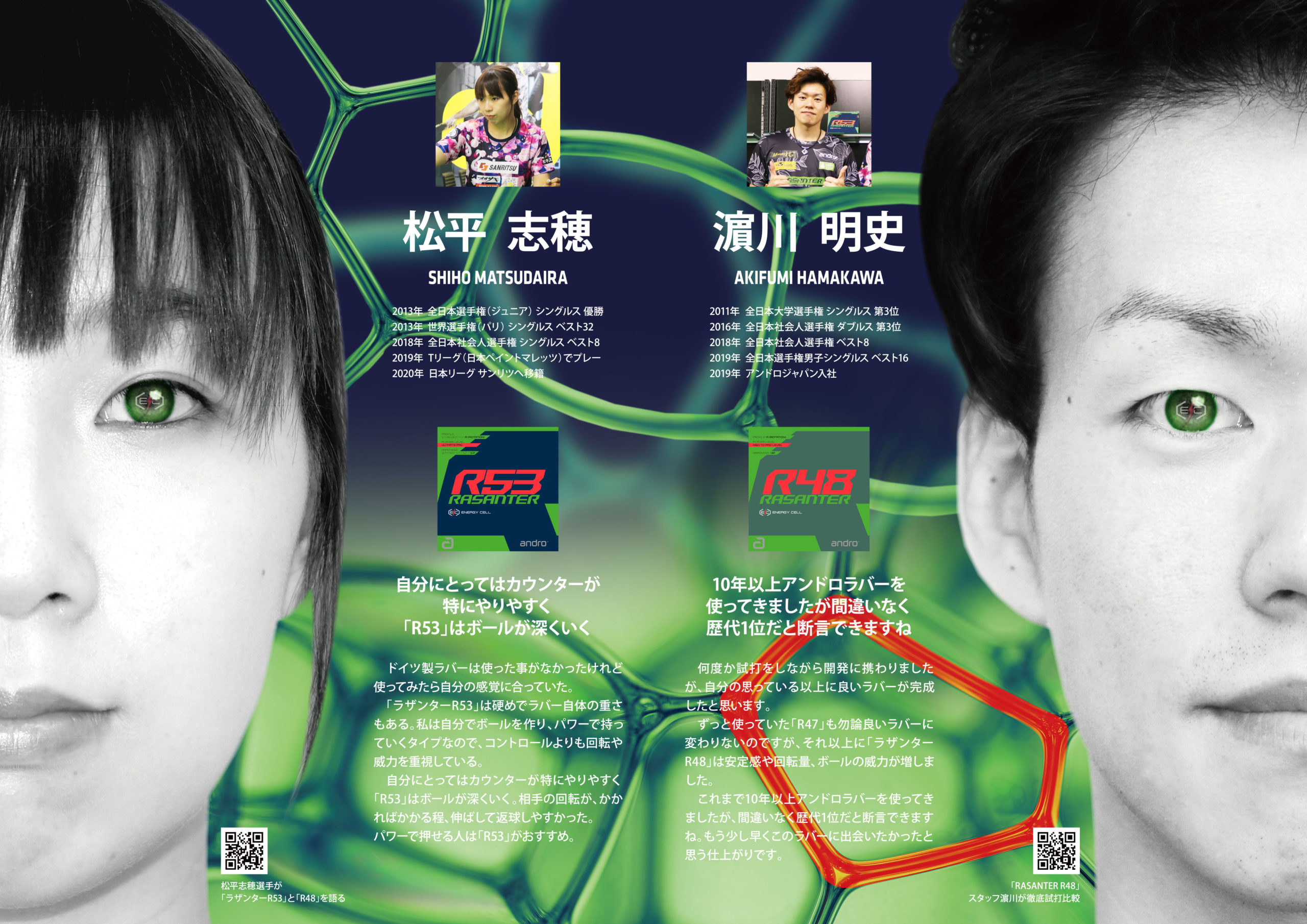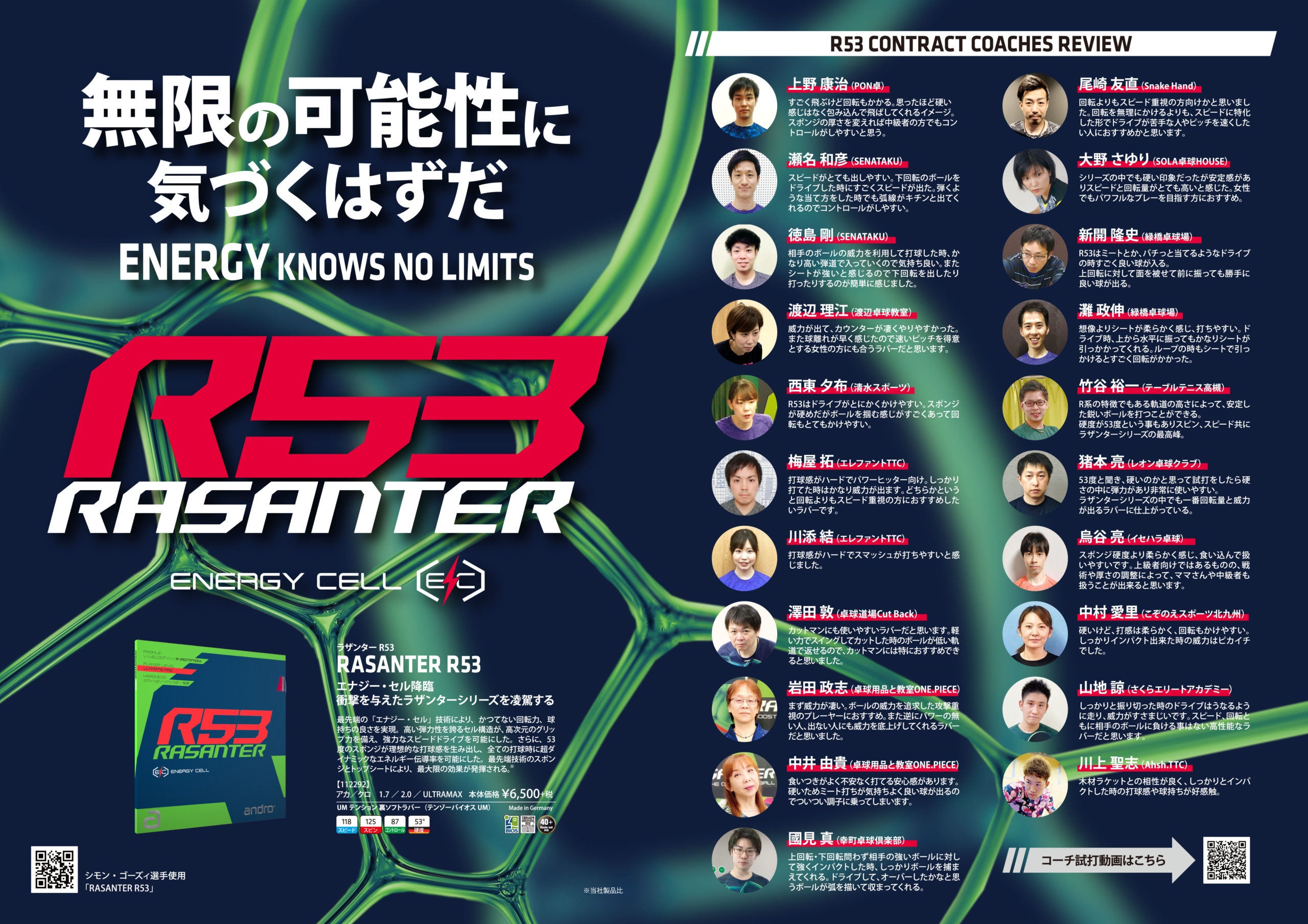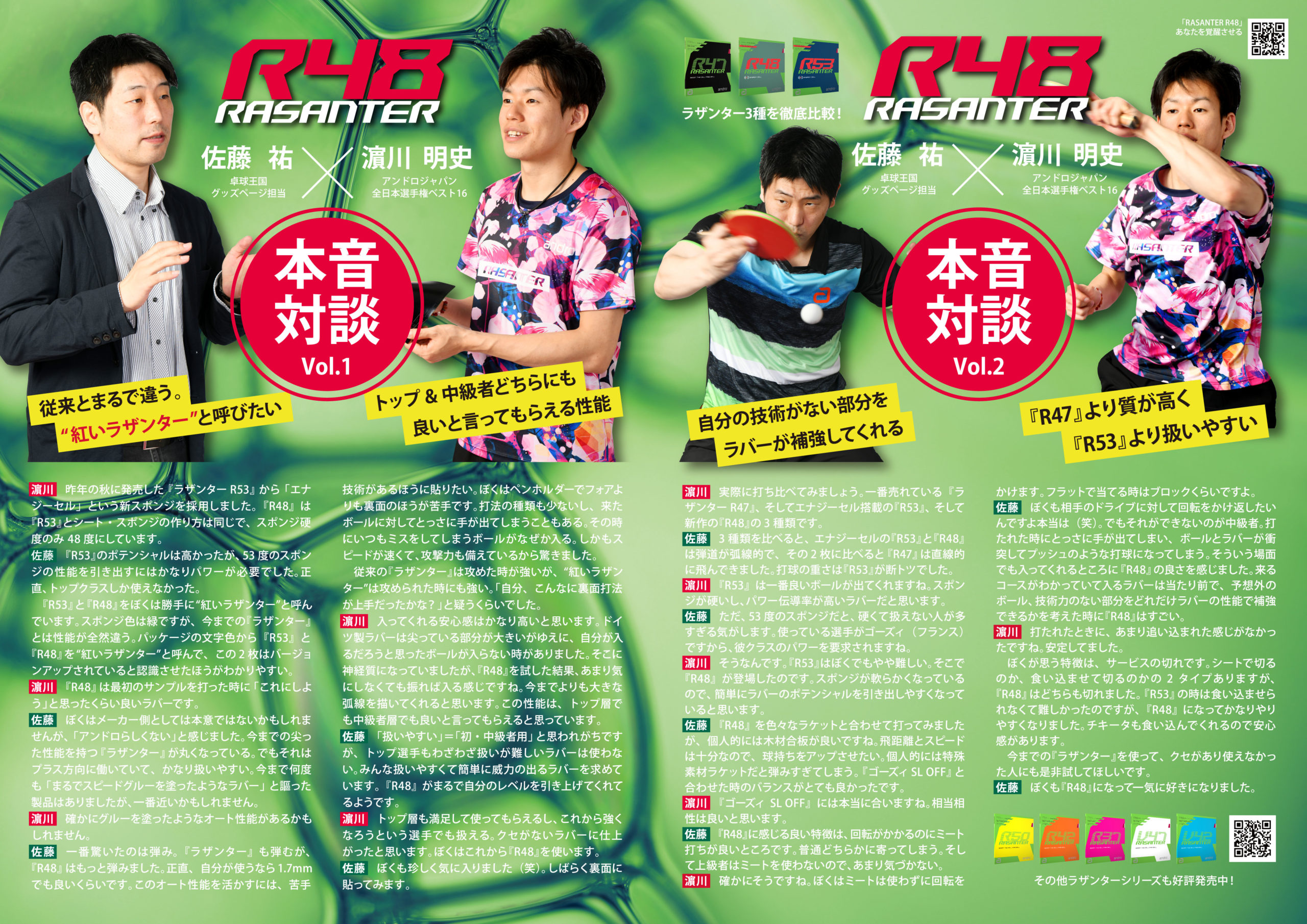 ラザンターR53、R48を使用する選手や契約コーチのコメント、卓球王国の佐藤祐さんとスタッフ濵川の特別対談も掲載。