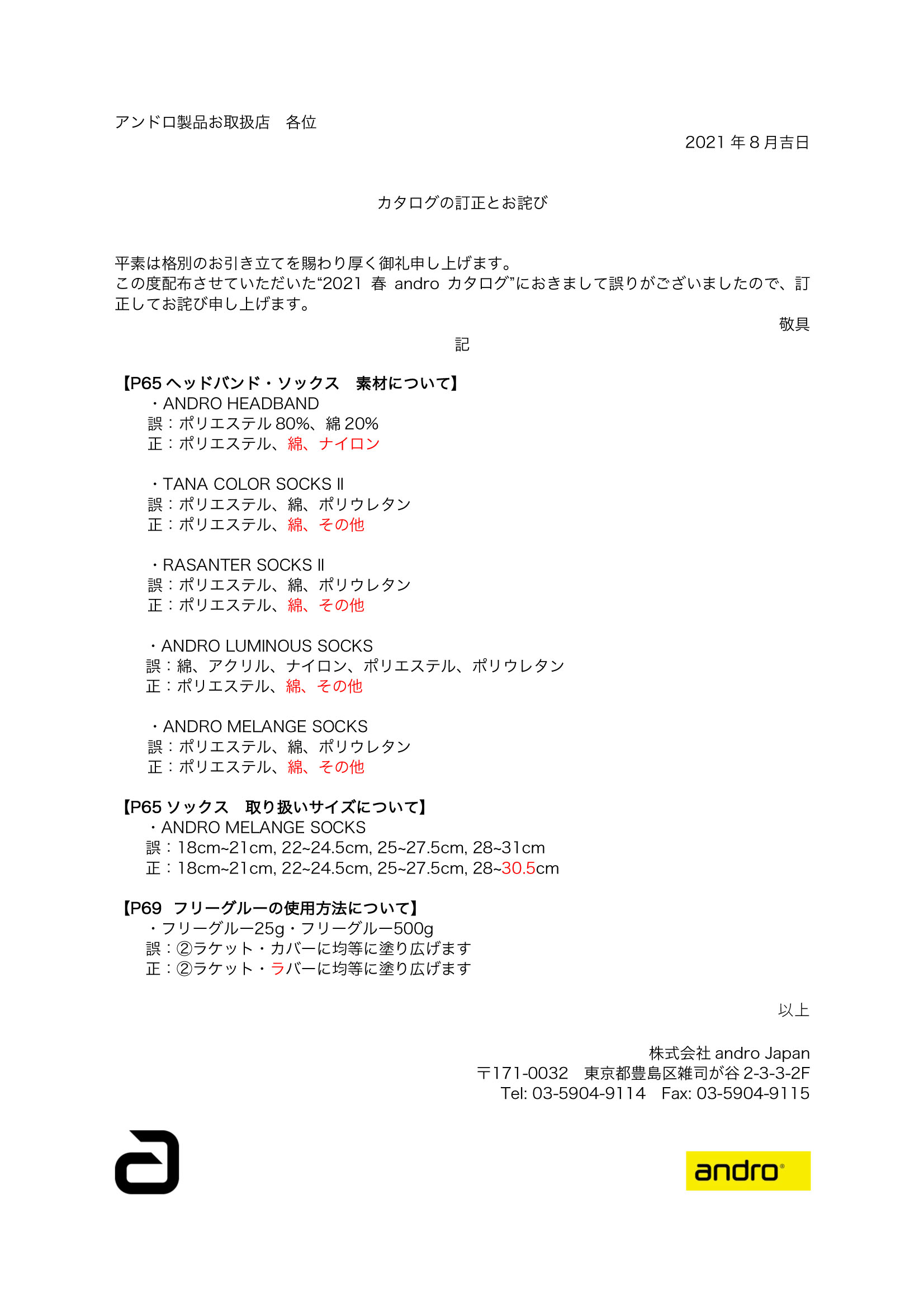 お詫びと訂正(カタログ記載表記)